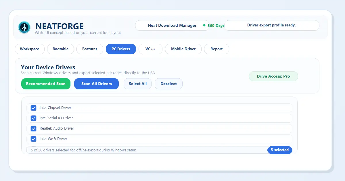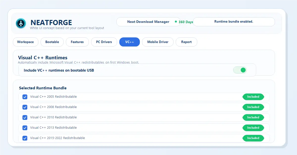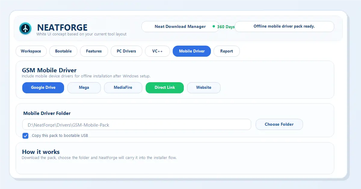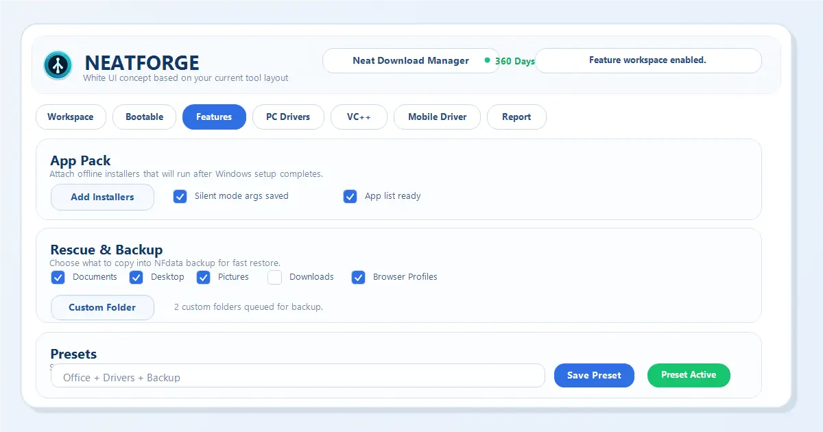 NeatForge is the most powerful post-install deployment and USB preparation tool designed for technicians, gamers, and system builders. Unlike risky custom OS builds from the internet, NeatForge respects your security. It acts as an advanced bootable USB maker that allows you to use your completely untouched, official Microsoft Windows 10 & 11 ISO files, while secretly packaging an intelligent offline payload.