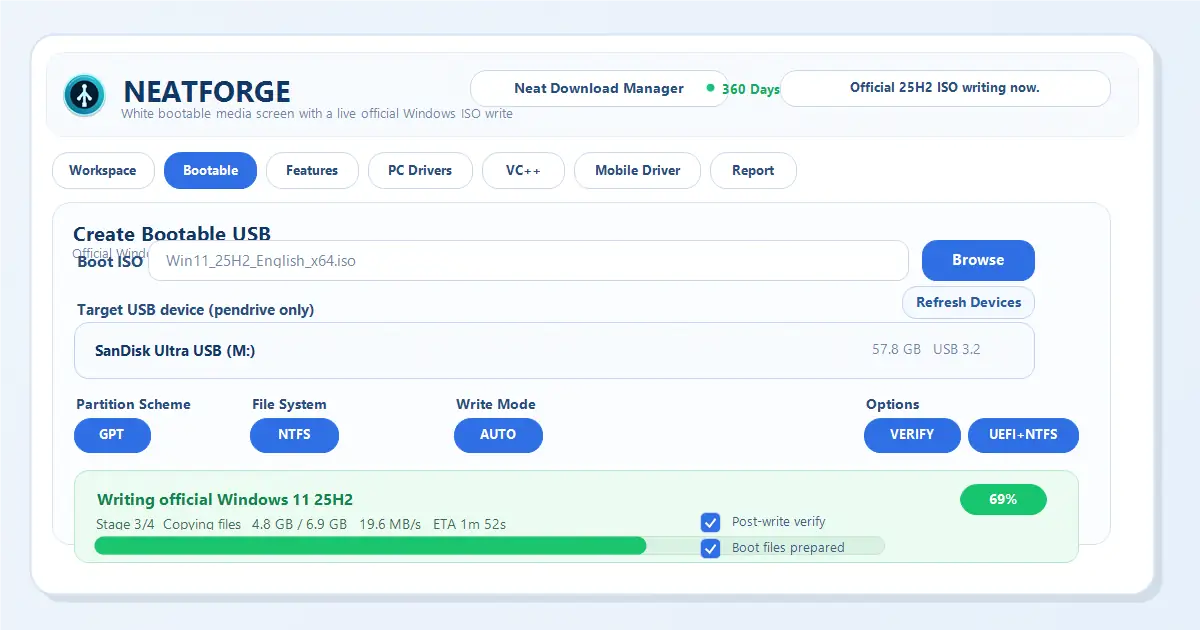 ๐ฅ Key Highlights of What NeatForge Can Do:- Official ISO Integration: Creates bootable USB drives using 100% authentic Microsoft Windows ISO images without corrupting core system integrity.