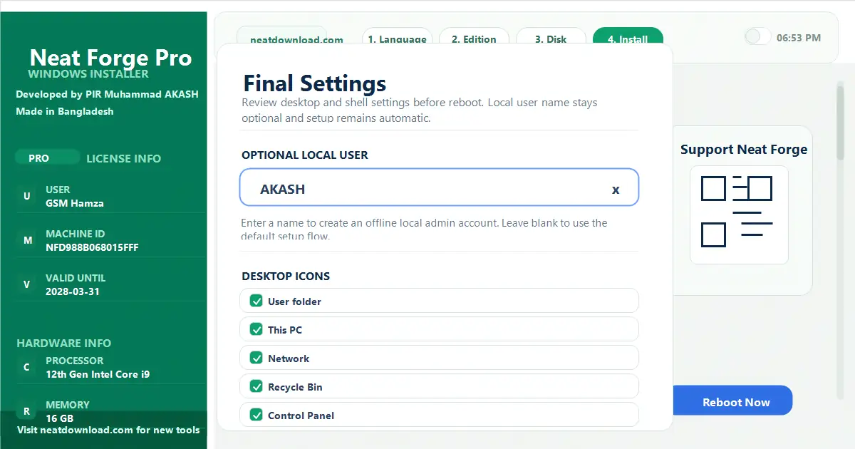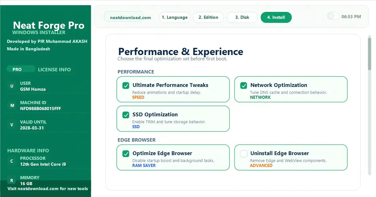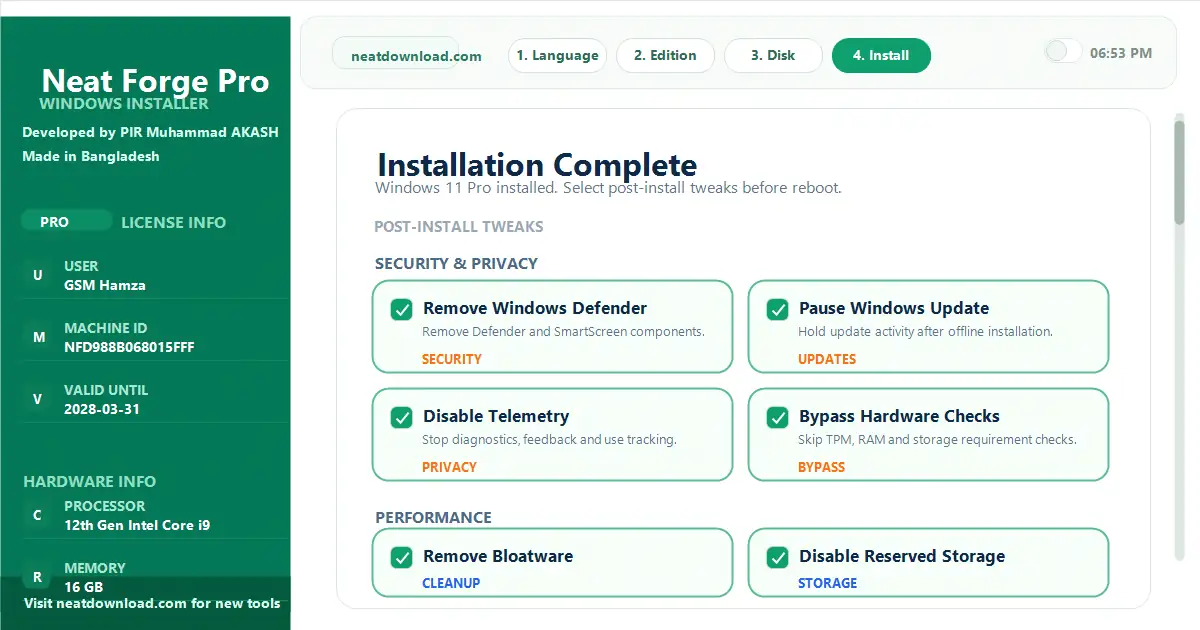 Once you install Windows using your newly created secure USB, NeatForgeโs automated engine kicks in at the very first desktop boot! It handles everything completely offlineโfrom instantly bypassing annoying Windows 11 TPM and Microsoft Account requirements, to automatically installing massive driver libraries, killing telemetry, tweaking registry files for max gaming FPS, and silently installing all your essential apps.